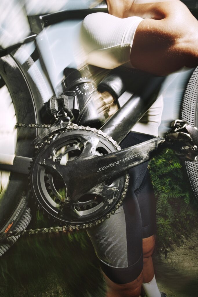 Sur route, la plateforme Super Record 13 se décline en 2×13 (disponible) et en 1×13 (mono route). Le premier vise la plage d’utilisation maximale, avec un étagement serré et un double plateau. Le second transpose la simplicité 1x sur asphalte, avec un dérailleur à embrayage pour maintenir la chaîne et des plateaux aéro spécifiques.