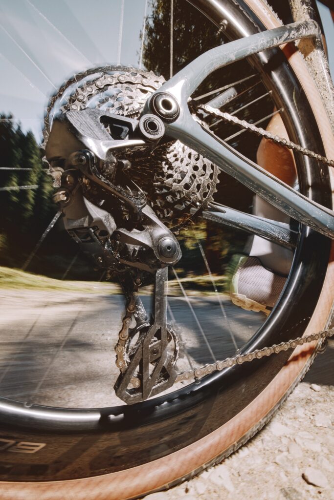 Le dérailleur Super Record X illustre l’adaptation gravel de la plateforme. La cinématique générale SR13 est conservée, mais la chape s’allonge et la structure se renforce pour absorber chocs et vibrations sans tolérances flottantes.