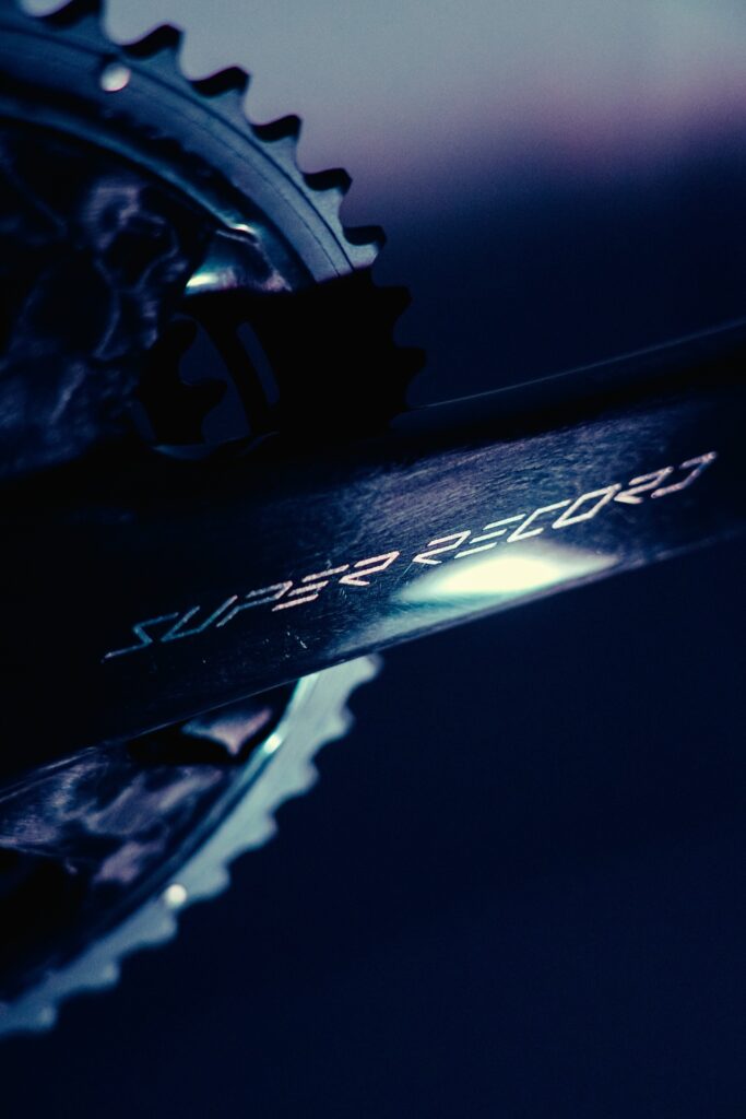 Le Super Record 13 Ultra est une mise à niveau du groupe 13 vitesses comprenant un plateau en carbone, une cassette avec pignons en titane et des roulements de boîtier en céramique.