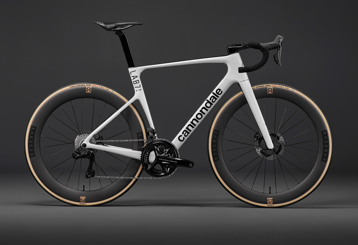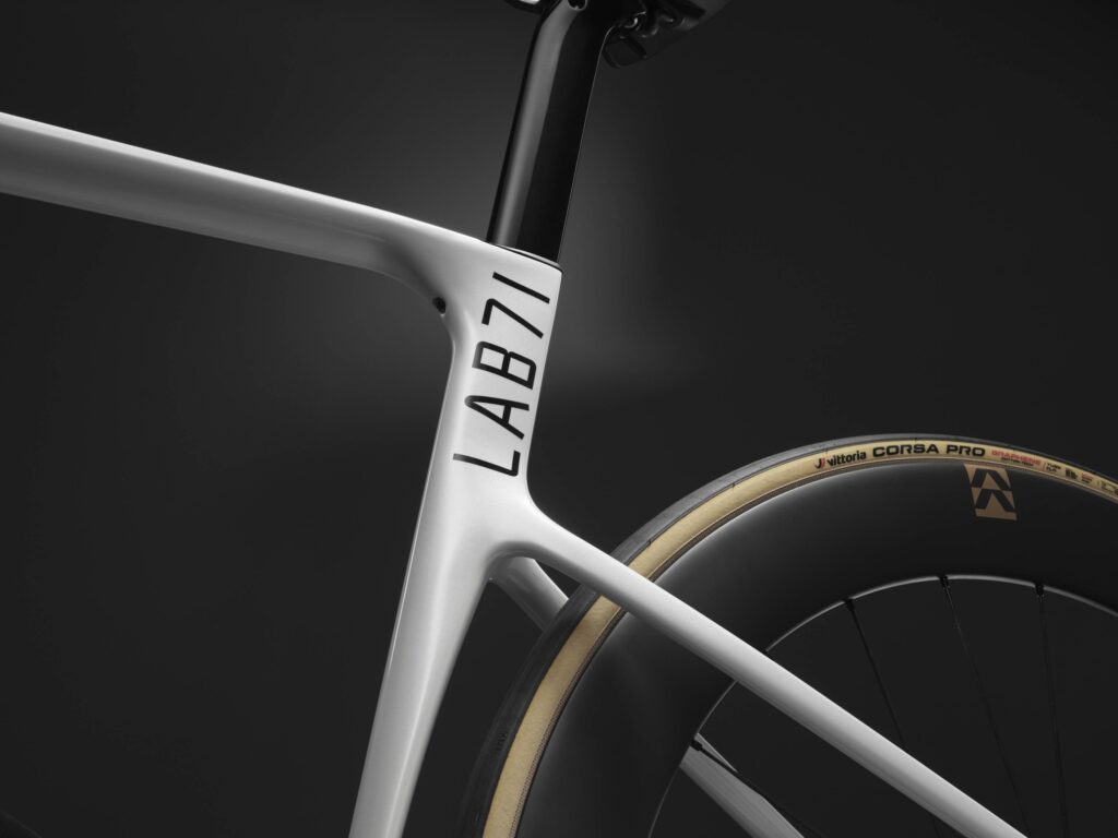 Au sommet, le LAB71 reçoit la stratification Série 0. Il est équipé de roues carbone haut profil (Reserve 57|64 en montage Shimano Dura-Ace Di2 avec moyeux DT 180 céramique), des capteurs de puissance d’origine et la visserie de tige de selle en titane.
