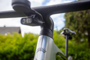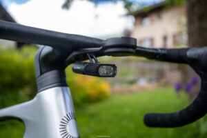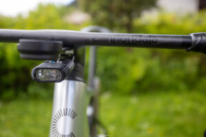 Le support de compteur est remarquablement bien intégré, il est robuste. La lumière avant est logée de manière sobre et discrète. L’orientation se règle facilement. L’intégration du câble de la lumière est propre, discret et efficace. Du super travail de finition dans les détails.