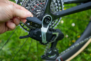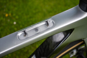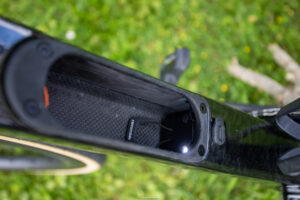 On peut recharger cette batterie via un petit cache accessible sur le tube inférieur sans sortir la batterie. Comme expliqué, cette batterie alimente également le dérailleur arrière SRAM AXS. Un câble relie la batterie interne avec une connectique SRAM spécifique.