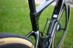 Si l’aérodynamisme du vélo est parfaitement optimisé en pénétration dans l’air « de face », le vent de côté se ressent principalement à haute vitesse sur les tourbillons en descente. Le cadre, de par l’épaisseur imposante de son tube inférieur, combiné aux roues Réserve 49 arrière/42 avant sont forcément plus sensible aux vents latéraux.