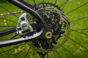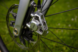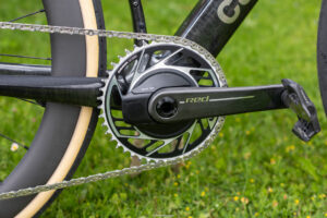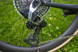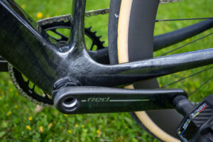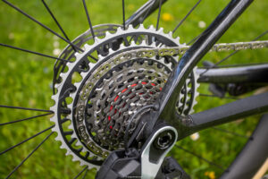 Le choix d’une transmission monoplateau SRAM RED XPLR AXS (ici un 1×13 avec un plateau de 40 dents couplé à une cassette 10-46) sur un vélo typé endurance haut de gamme peut surprendre.