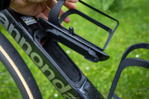 Le compartiment StashPort, situé dans le tube diagonal, est une excellente surprise : accessible sous le porte-bidon, il permet de transporter des outils, chambre à air, barres, voire une veste légère. L’espace est vaste ! La sacoche fournie (StashBag) est bien conçue et maintenue fermement. En usage réel, la capacité de stockage est précieuse pour les longues sorties. L’ouverture est facile, la fermeture rapide et sûre.