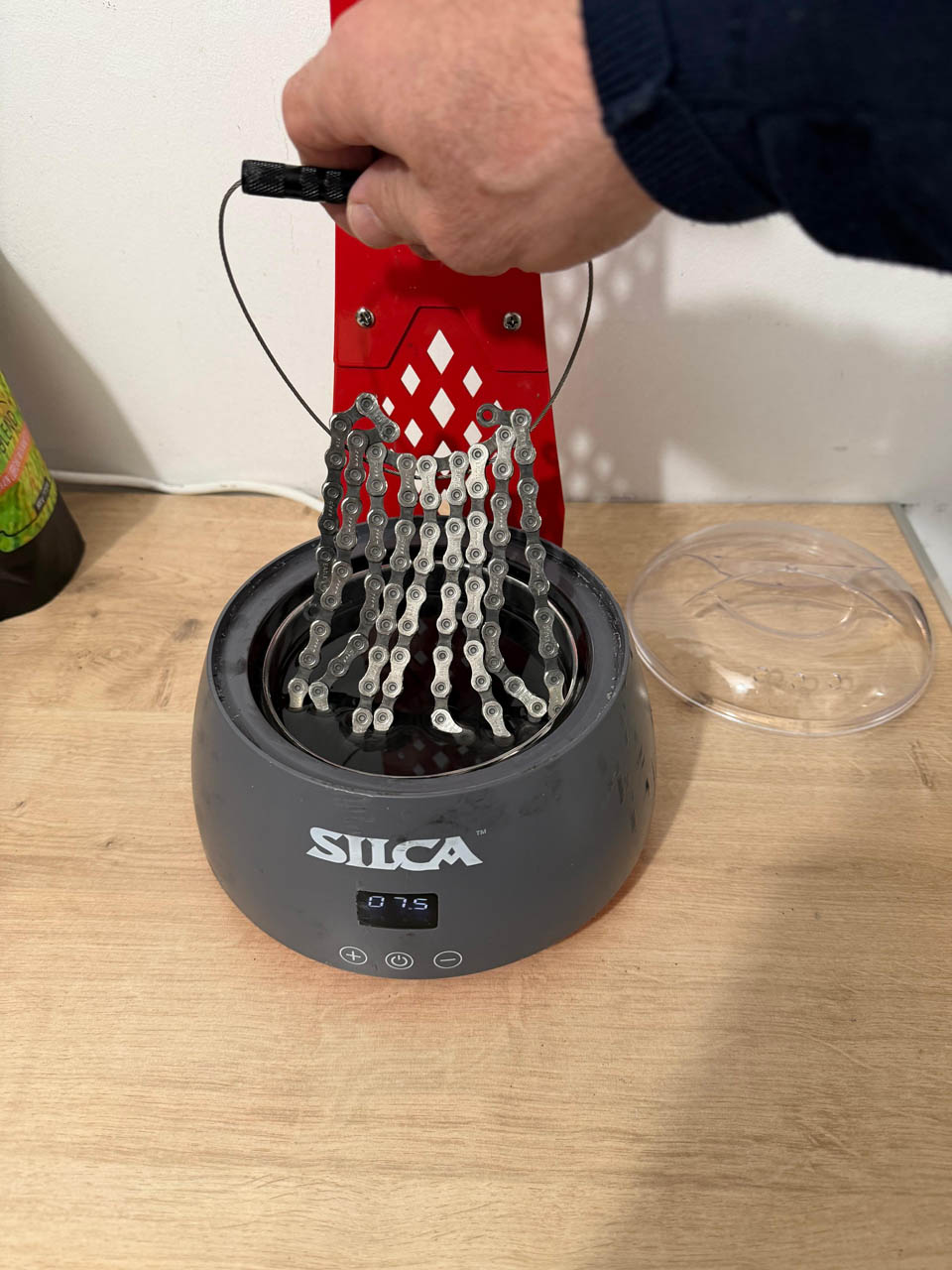 Le bain chaud est la méthode la plus aboutie pour imprégner la chaîne. Le principe consiste à faire fondre un mélange de cire dans un récipient dédié, à maintenir la température recommandée par le fabricant, puis à immerger la chaîne propre et sèche. Une agitation douce aide la cire liquide à chasser l’air des rouleaux et à pénétrer les axes. Après quelques minutes d’imprégnation, on ressort la chaîne en la suspendant pour laisser l’excédent s’égoutter et durcir. Un léger travail manuel, une fois la cire figée, casse les ponts de cire entre les maillons afin d’éviter toute rigidité au premier tour de pédale.