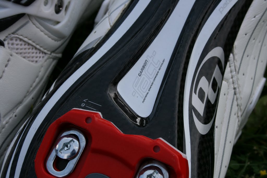 Les chaussures sont légères, bien finies et la rigidité de la semelle carbone est très appréciable. J’ai apprécié la présence de la graduation sous les chaussures ce qui facilite le montage des cales de pédales automatiques. La présence d’une partie granuleuse permet à la cale de ne pas glisser.