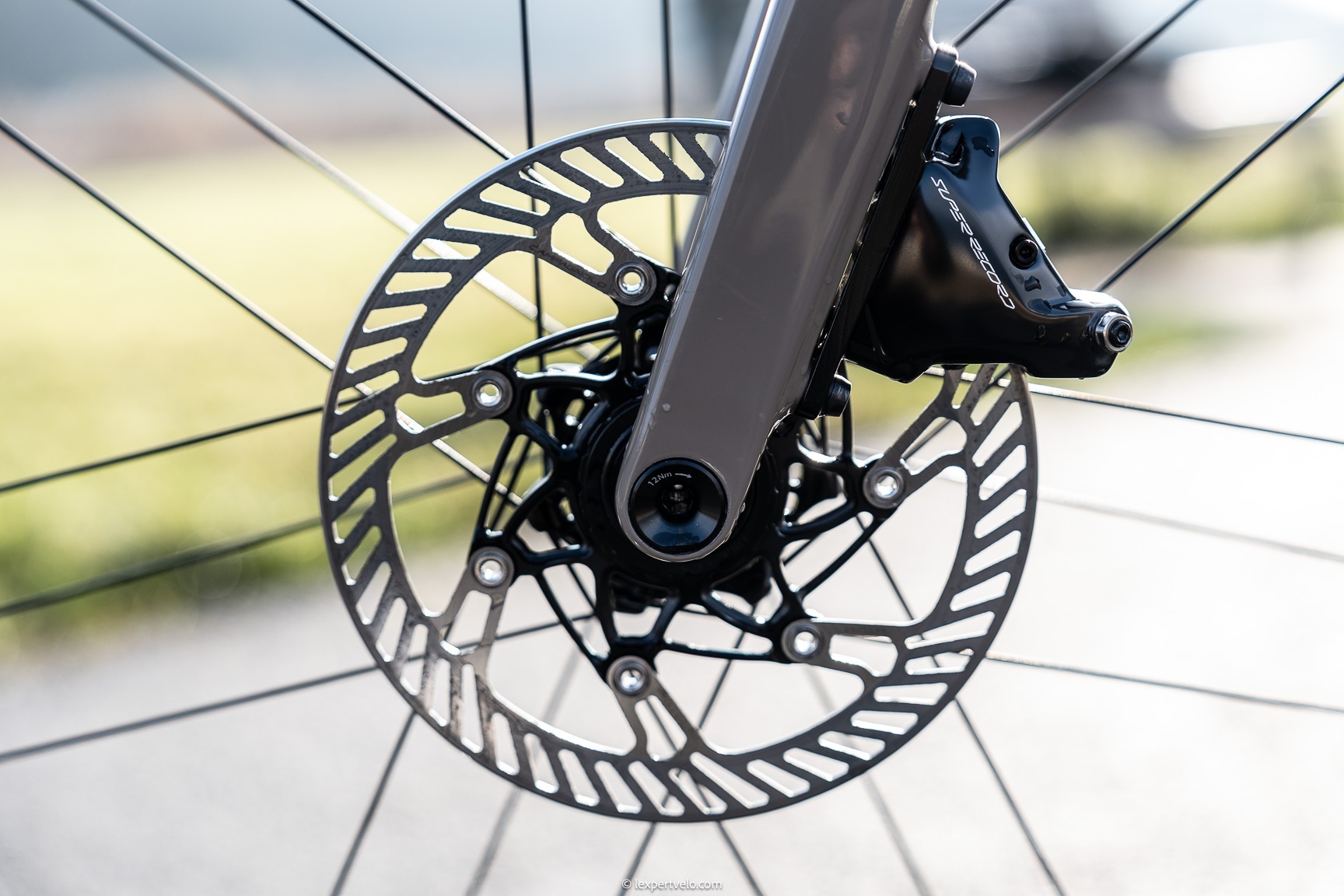 Campagnolo reste sobre dans les tailles proposées. Le disque de 140 mm couvre l’essentiel des usages route, y compris la montagne sèche pour des gabarits standards. Le 160 mm à l’avant s’adresse aux cyclistes plus lourds, aux parcours comportant de très longues descentes ou aux conditions particulièrement exigeantes. Ce dimensionnement reflète la philosophie du système : rechercher l’équilibre global plutôt que la surenchère de chiffres.