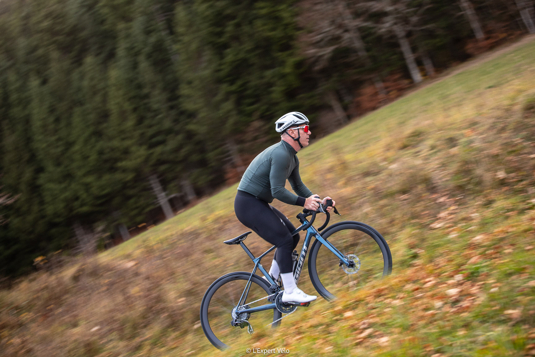Le revers de cette médaille se découvre sur les sections plus rugueuses. Le TCR 2025 n’est pas moins confortable parce que le cadre serait devenu brutal ; il l’est parce que les nouvelles roues jouent un rôle déterminant dans la signature dynamique du vélo. Les jantes Giant SLR 0 40 sont d’une efficacité remarquable, mais elles durcissent l’ensemble. Le contraste est flagrant lorsqu’on remonte une paire de roues différentes : le vélo retrouve immédiatement un filtrage plus feutré. La rigidité avant tout, le confort en option.