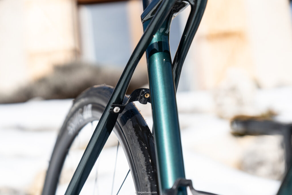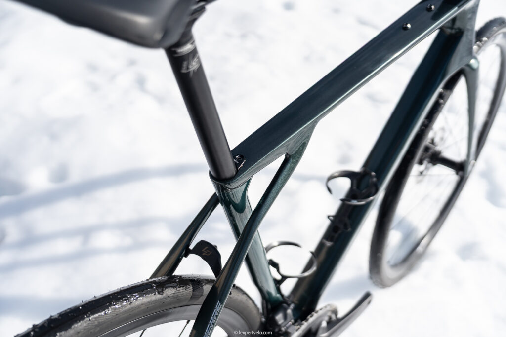 Les détails pratiques confirment cette vocation. On trouve des inserts sur le top tube pour installer une sacoche ou un porte-bidon supplémentaire. Il y a aussi des supports pour garde-boue.