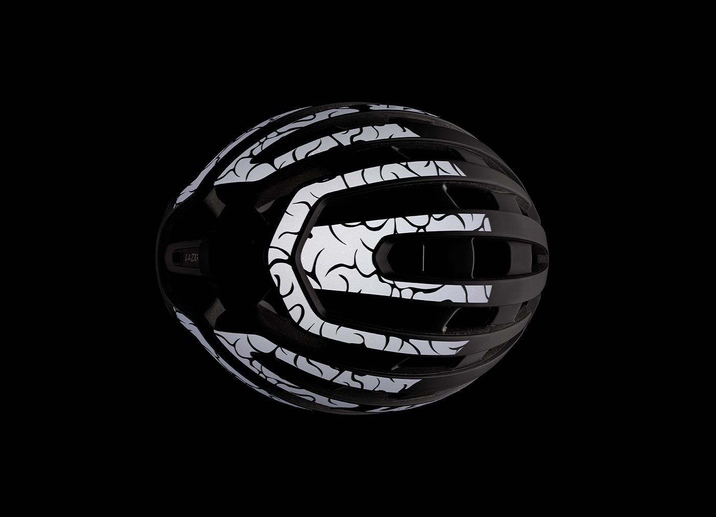 La signature visuelle de cette édition spéciale du Lazer Z1 KinetiCore se concentre sur la sécurité passive. Le casque adopte une base noir mat très sobre, rehaussée d’un motif noir subtil qui dévoile, sous l’éclairage des phares, un dessin complet de cerveau à l’arrière. Cette approche discrète de jour et hautement visible de nuit fait sens pour les cyclistes de route et de gravel qui roulent tôt le matin, tard le soir ou en conditions urbaines. Le choix d’une activation par lumière incidente vise à maximiser la détection par les conducteurs sans surcharger l’esthétique, souvent décisive pour l’adoption quotidienne d’un casque.