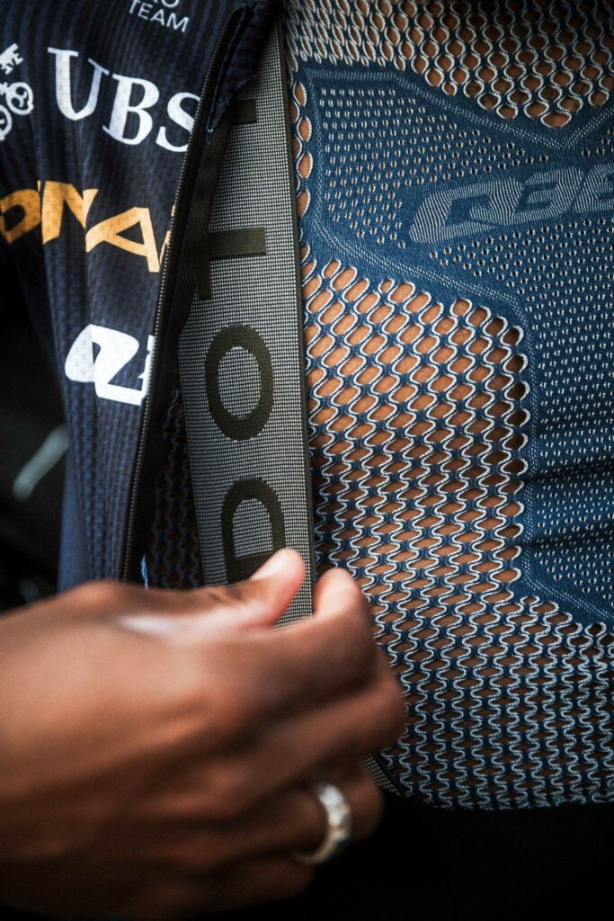 - Le maillot Gregarius Clima repose sur une cartographie à trois tissus qui cible ventilation, maintien et aérodynamique.