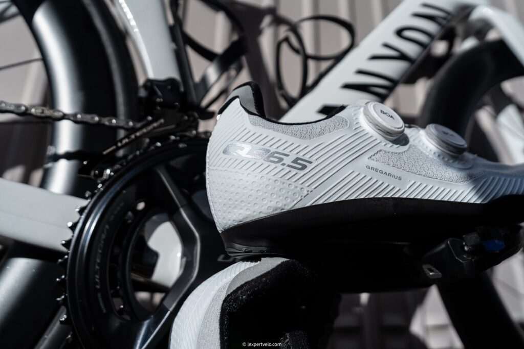 D’un point de vue esthétique, surtout en blanc, la Gregarius adopte une ligne sobre et valorisante. Elle a de la présence sur le vélo et s’intègre bien à un montage haut de gamme. De près, on repère toutefois quelques traces de colle visibles sous la semelle.