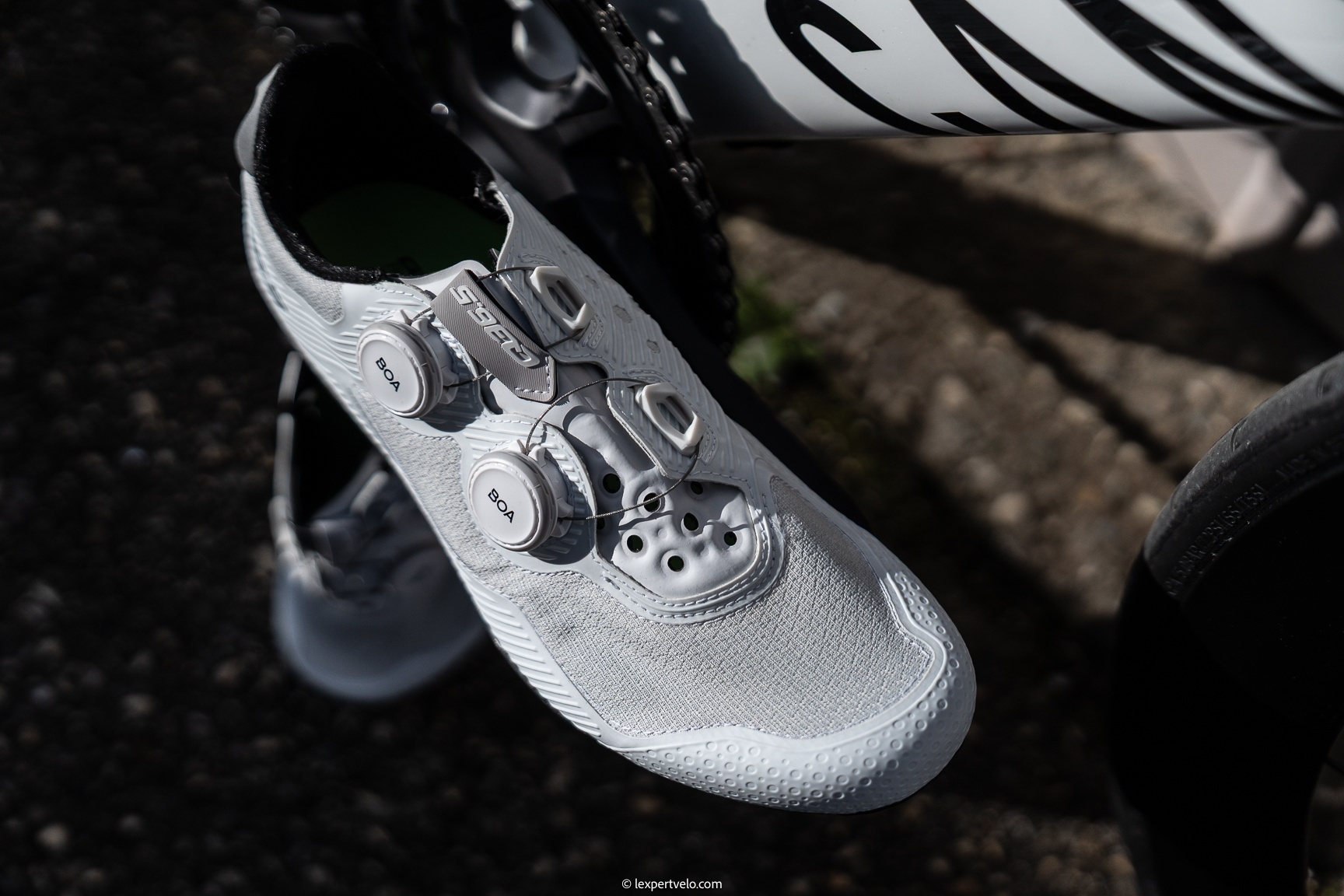 Le cahier des charges repose sur une semelle carbone composite (carbone + polyamide) pour la transmission, un double BOA Fit System pour la précision du serrage, un avant-pied au volume plus accueillant et une semelle intérieure Solestar orientée stabilité.