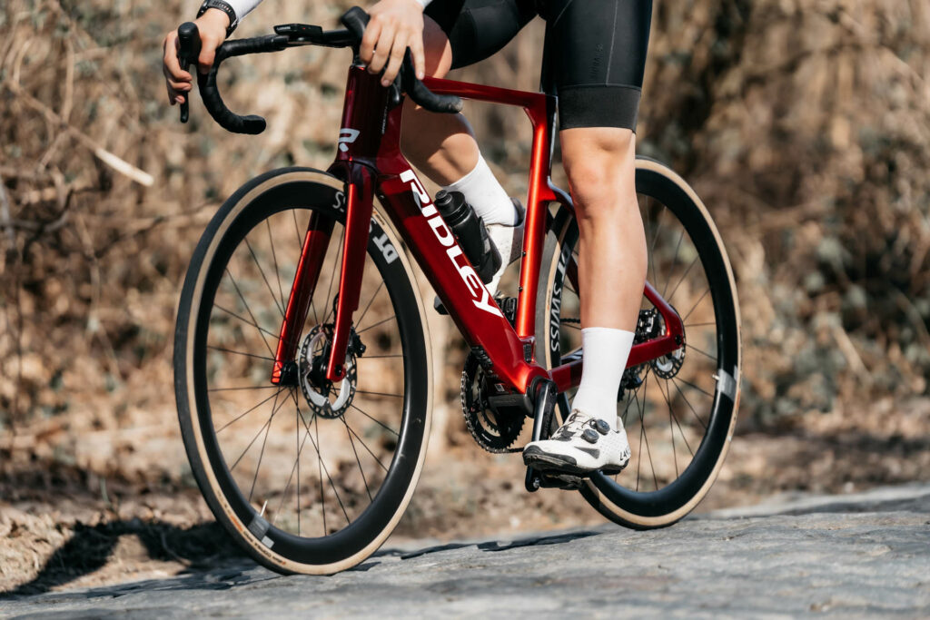 Ridley annonce une géométrie légèrement plus tolérante que celle d’un pur modèle de course, un choix pertinent pour un e‑race bike qui vise les longues journées en selle. Concrètement, cela signifie une position qui facilite la tenue d’une allure aéro prolongée, en ménageant la nuque et le bas du dos. La stabilité à haute vitesse et la précision de trajectoire en descente restent des priorités, car l’assistance permet d’enchaîner les efforts et d’allonger les parcours, ce qui augmente l’exposition aux phases rapides.