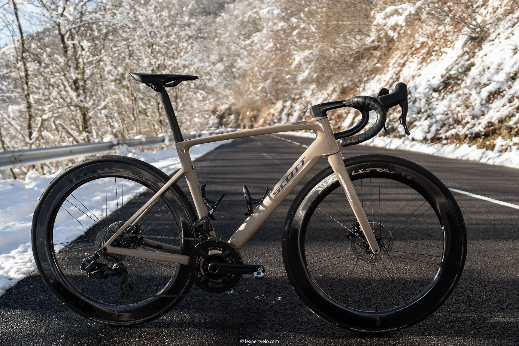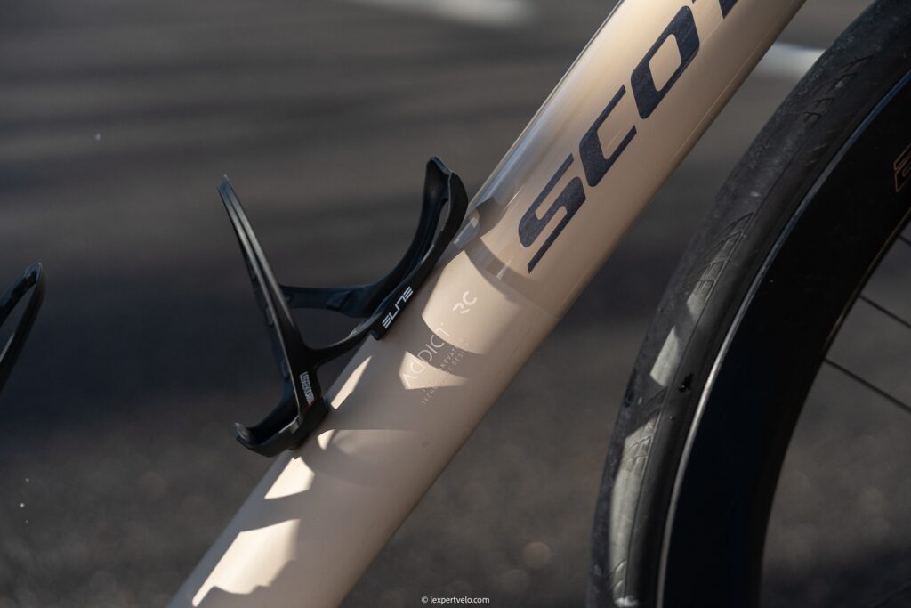 Note : Notre modèle de test est équipé avec une configuration spécifique que vous ne trouverez pas à l’identique chez un revendeur. C’est un montage à la carte. La cadre est une base Scott Addict RC Pro en carbone HMX et la fourche HMF.