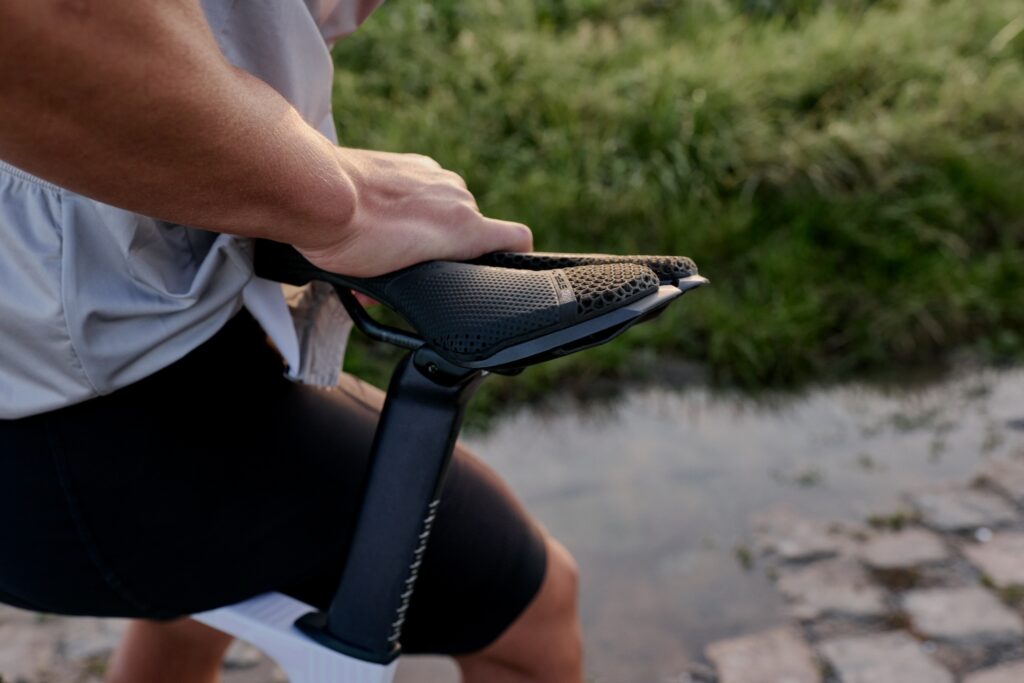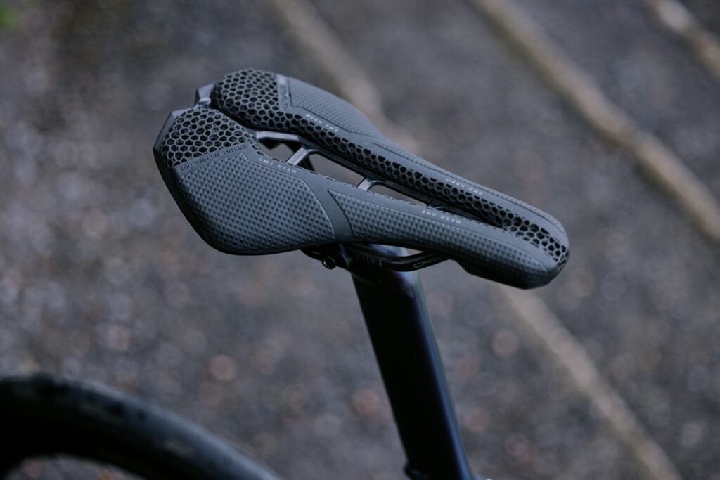 La signature de la selle réside dans la modulation de densité rendue possible par l’impression 3D. La partie avant utilise une maille à haute densité destinée à offrir du soutien quand le cycliste bascule le bassin vers l’avant en position d’attaque. En posture plus droite, la zone centrale moins dense répartit la charge sur une plus grande surface, ce qui diminue les risques de points chauds et d’engourdissements liés à une pression concentrée. Enfin, l’arrière adopte une densité plus faible qui allège l’ensemble sans pénaliser le confort, la zone étant moins sollicitée pendant le pédalage.