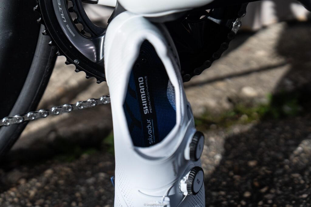 Dès l’enfilage, la Shimano S-Phyre RC903 surprend par son absence de points de pression immédiats, y compris sur des zones sensibles comme la malléole ou le cou-de-pied. La construction enveloppante à 360° entoure le pied sans le contraindre. Ainsi, cela facilite un positionnement naturel de l’avant-pied et du médio-pied. La pointure habituelle s’est avérée juste, malgré la réputation historique de la marque de « tailler petit ».