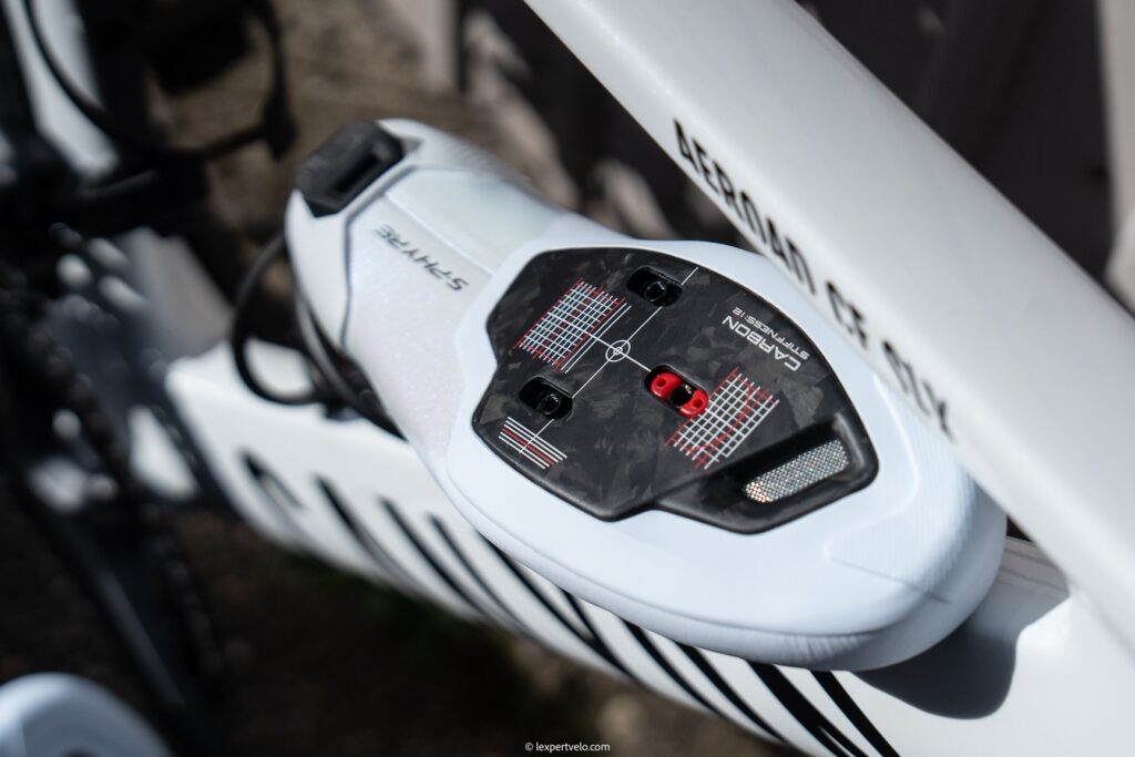 - La semelle carbone à indice de rigidité 12/12 assure un transfert de puissance direct sans flexion perceptible lors des relances et passages en danseuse.