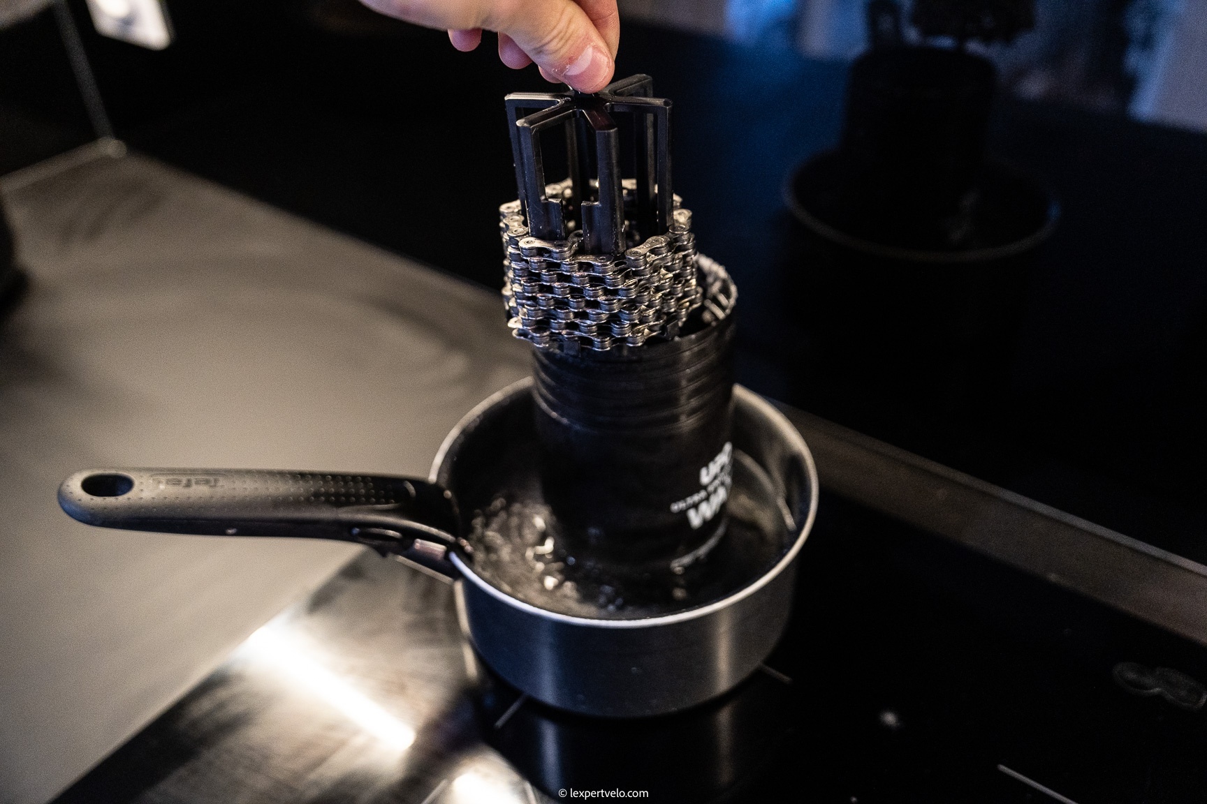 À retenir : La cire chaude sur chaîne réduit l’usure, garde la transmission propre et améliore le rendement. Avec le kit CeramicSpeed UFO Ultra Endurance, la préparation s’effectue au bain-marie pour une imprégnation profonde et durable. Bien dégraisser reste la condition sine qua non pour bénéficier pleinement de la cire chaude.
