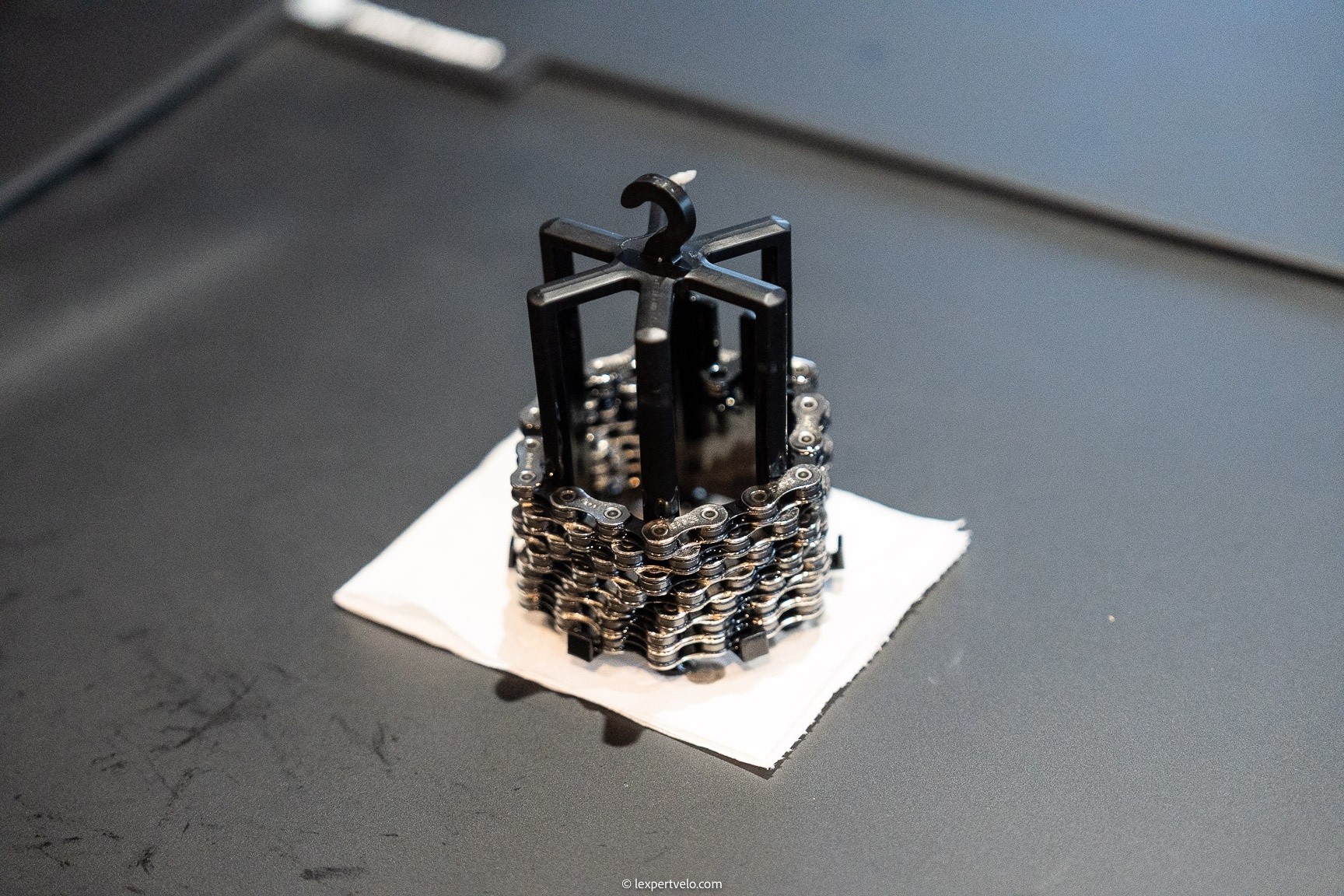 Pour prolonger l’intervalle entre deux bains, il est possible d’utiliser une cire liquide entre deux recharges complètes. On applique une quantité plus généreuse qu’une huile classique. Ensuite, on respecte un temps de séchage réel. Idéalement : application la veille pour le lendemain, afin que la cire se fige correctement au cœur des maillons.