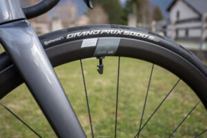 Ce montage asymétrique permet de conserver une excellente maniabilité sans compromettre la performance sur le plat ou en descente rapide. Le comportement global gagne en cohérence : le vélo reste vif et précis à l’avant, tout en capitalisant sur l’inertie et la rigidité de la roue arrière pour maintenir la vitesse.