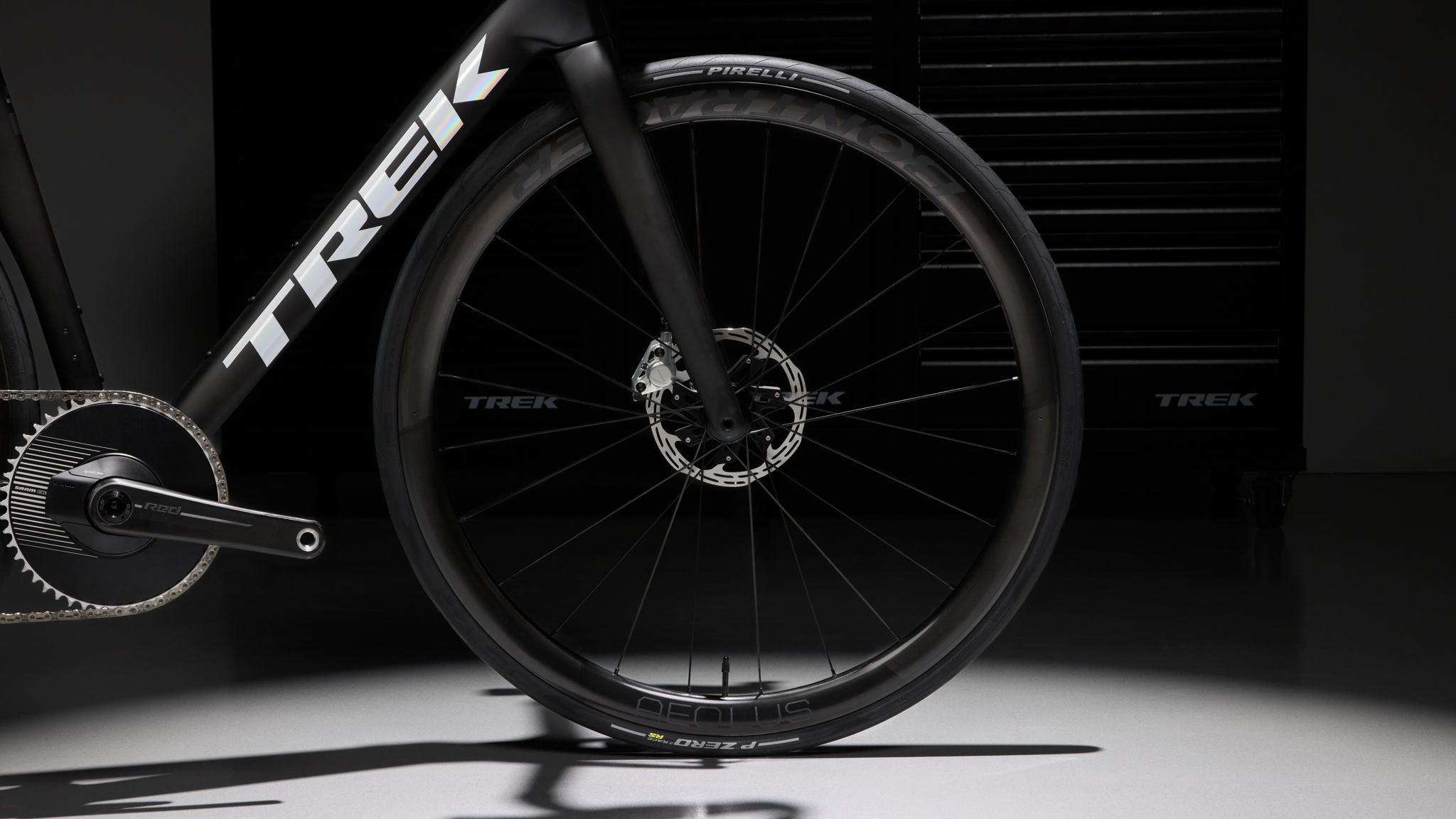 Le complément de l’allègement passe par les masses en rotation. Trek équipe ce Madone Gen 8 1x des roues Aeolus RSL 37 et de pneus Pirelli P-Zero RS, associés à des chambres à air TPU Pirelli SmartTube. L’objectif est double : limiter l’inertie pour une relance nette et conserver une vitesse de croisière efficace sans pénaliser la stabilité latérale.