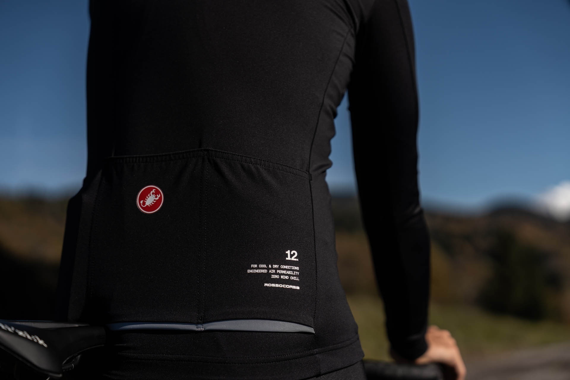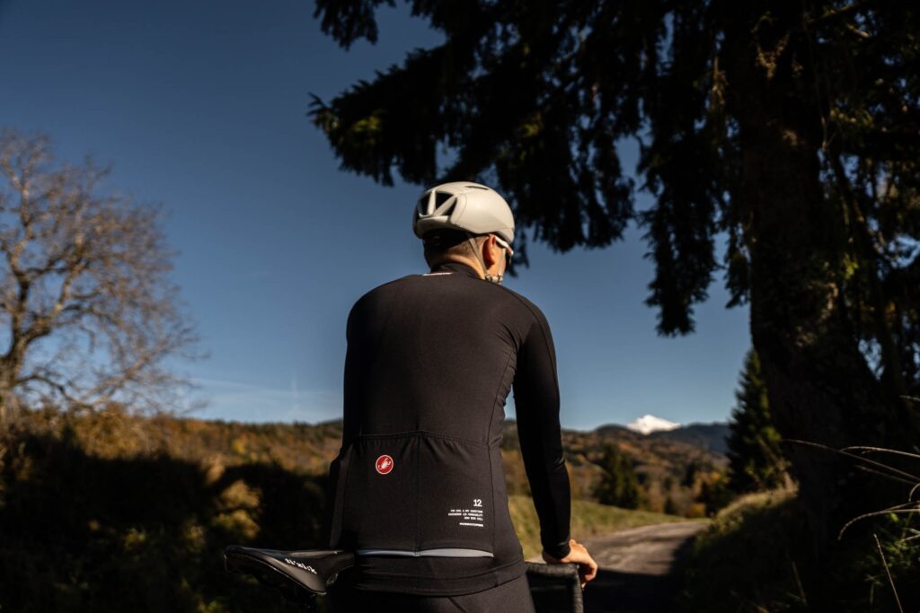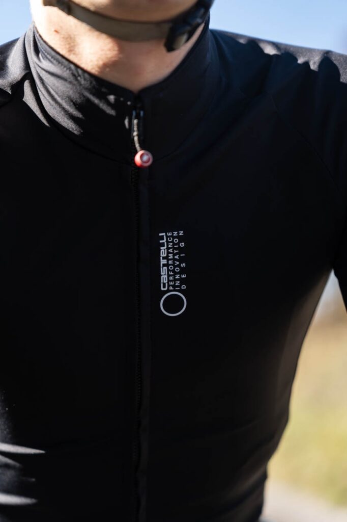 La coupe est résolument « Race Fit », à porter très proche du corps. Castelli recommande un ajustement proche du corps pour que la thermorégulation livrée par la perméabilité contrôlée fonctionne à plein. Le textile très extensible préserve le confort malgré cette proximité, et les manches sensiblement longues rassurent les cyclistes aux bras étirés, souvent mal servis par des longueurs standard.